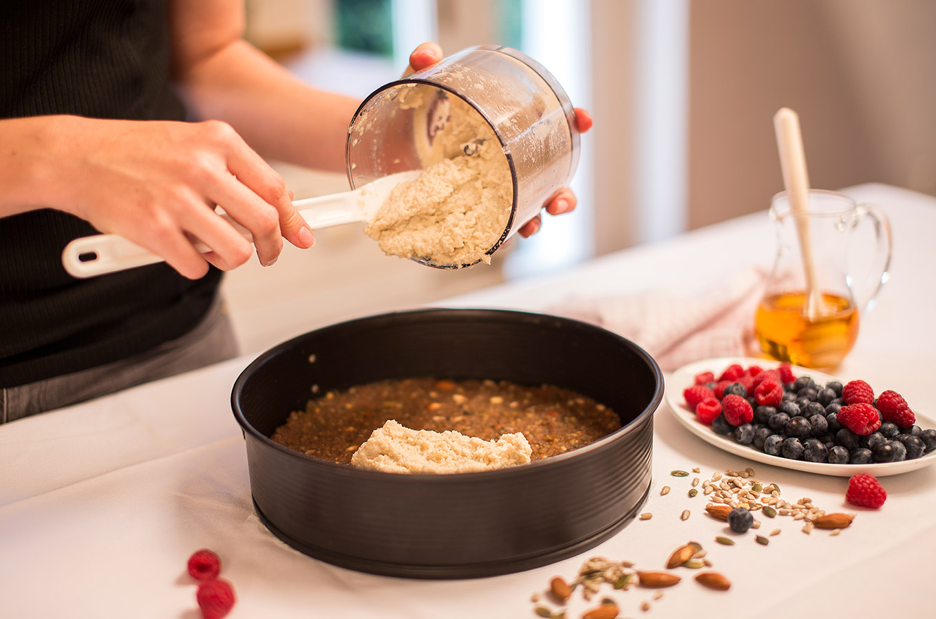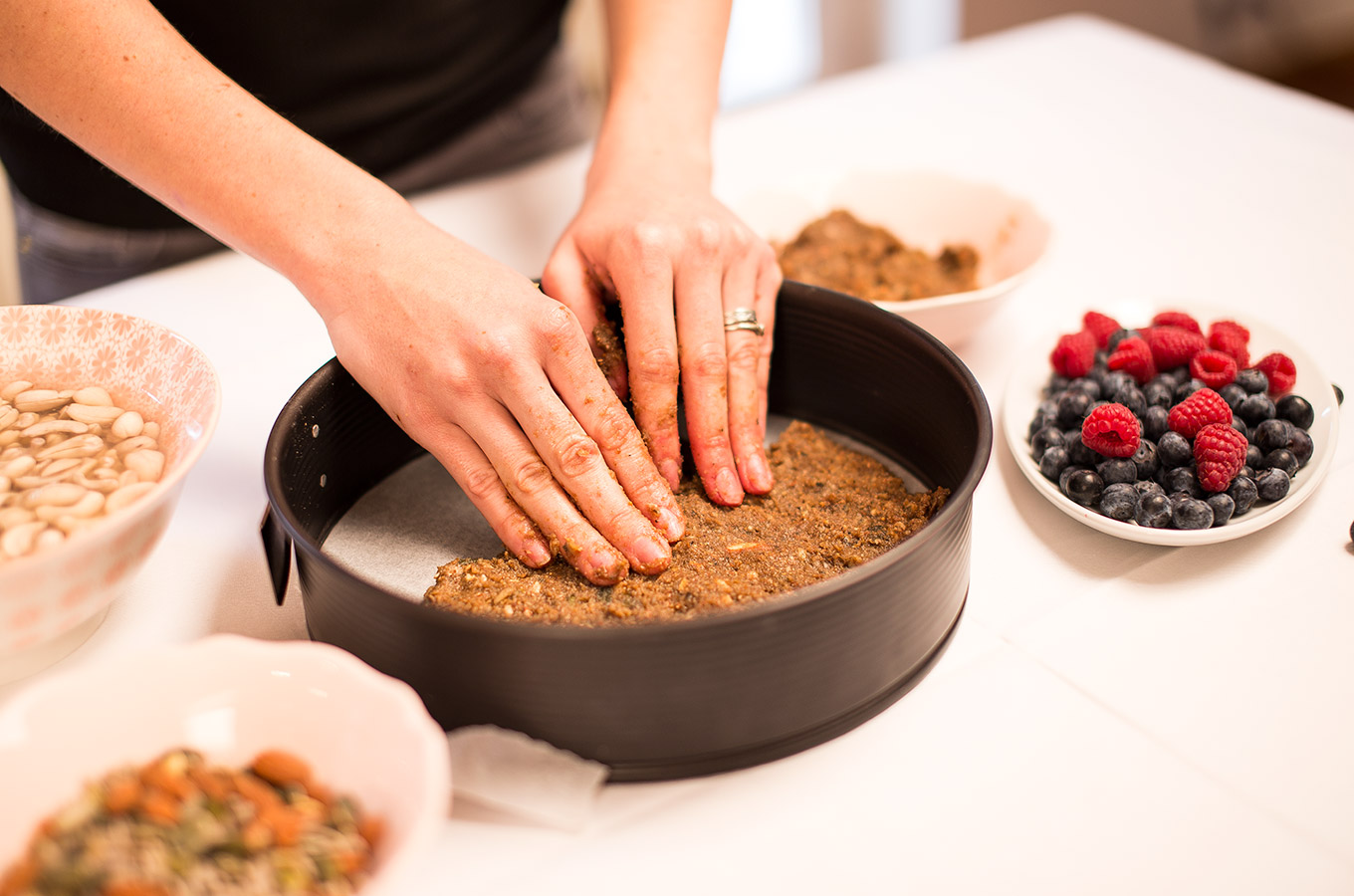 V procesore najprv spolu rozsekáme orechy, až potom pridáme datle a kokosový olej. Datle necháme vopred namočiť cez noc, orechy na korpus vopred nenamáčame. Zmes rozmixujeme na hustú lepkavú hmotu, ktorou vystelieme dno tortovej formy, ako aj boky do troch štvrtín výšky. Formu nie je potrebné vopred vymastiť.