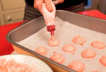 Tvarovanie a pečenie domácich makróniek: Cukrárske vrecko naplníme cestom a na plech vystlaný papierom na pečenie vytvoríme malé kolieska s priemerom 3 – 5 cm. Necháme ich 30 minút postáť, aby sa nám na povrchu vytvorila „škrupinka“. Pečieme v predhriatej rúre na 170 °C približne 10 minút. Po upečení necháme makrónky vychladnúť priamo na plechu.