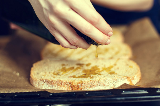 Plátky chleba pokvapkáme olejom a dáme zapiecť do rúry dochrumkava (5 minút pri teplote 180 °C). Môžeme použiť aj hriankovač či panvicu.