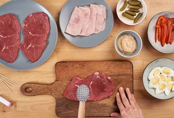 Mäso jemne naklepeme, osolíme, okoreníme a potrieme z jednej strany horčicou.
