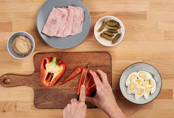 Natvrdo uvarené vajcia a uhorky prekrojíme na štvrtiny, papriku na osem pásikov.