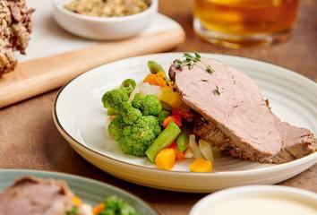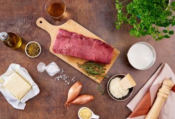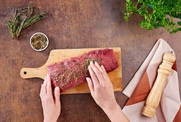 Pridáme listy tymianu, 1 čajovú lyžičku koňaku, soľ a korenie podľa chuti. Mäso nakrájame na plátky a na tanieri prelejeme omáčkou. Podávame so zelenými fazuľkami alebo varenou špargľou.