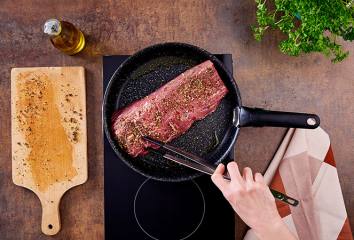 Na panvicu dáme olej a sviečkovú prudko opečieme zo všetkých strán. Dáme na plech a pečieme asi 25 minút. Upečenú sviečkovicu presunieme na dosku a necháme odpočívať 10 – 15 minút.