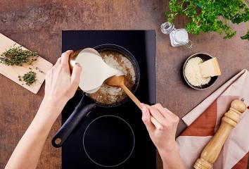 Panvicu odtiahneme z ohňa, nalejeme do nej koňak. Vrátime na oheň a po zovretí povaríme 1 – 2 minúty.