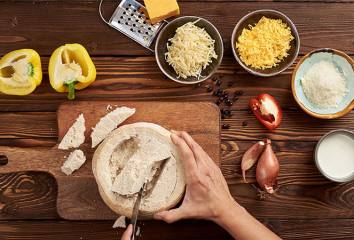 Rúru predhrejeme na 190 °C. Z chleba odrežeme vrch tak, aby sme mali veko na fondue.