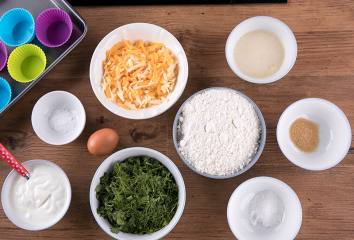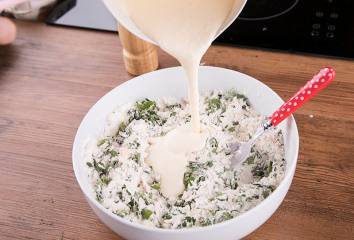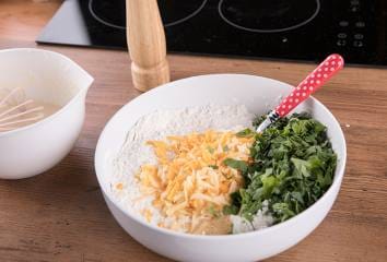 V miske zmiešame múku, prášok do pečiva a sódu bikarbónu. Pridáme bylinky, syr, cukor a dobre premiešame.