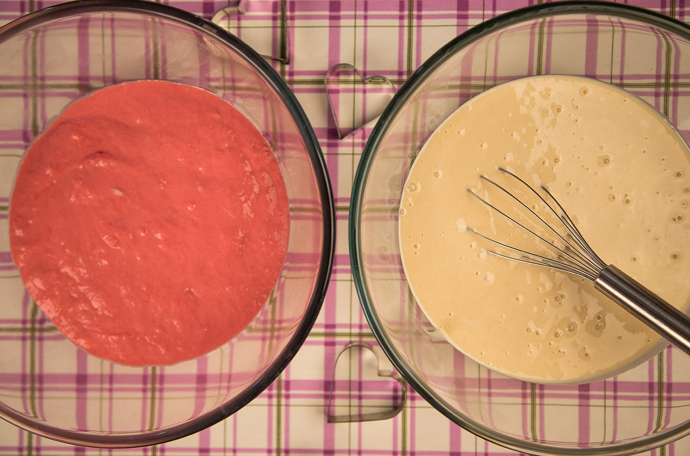 Maslo s cukrom vyšľaháme do svetlej peny a postupne pridáme žĺtky a mlieko. Potom pridáme múku zmiešanú s práškom do pečiva a vyšľahaný sneh z bielok. Nakoniec štipku soli a všetko spolu vymiesime. Polku cesta odložíme a do druhej pridáme cviklovú šťavu a ak je cesto príliš riedke, pridáme múku.