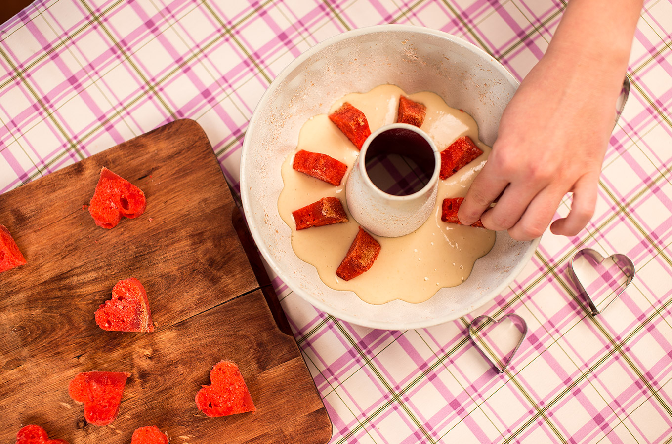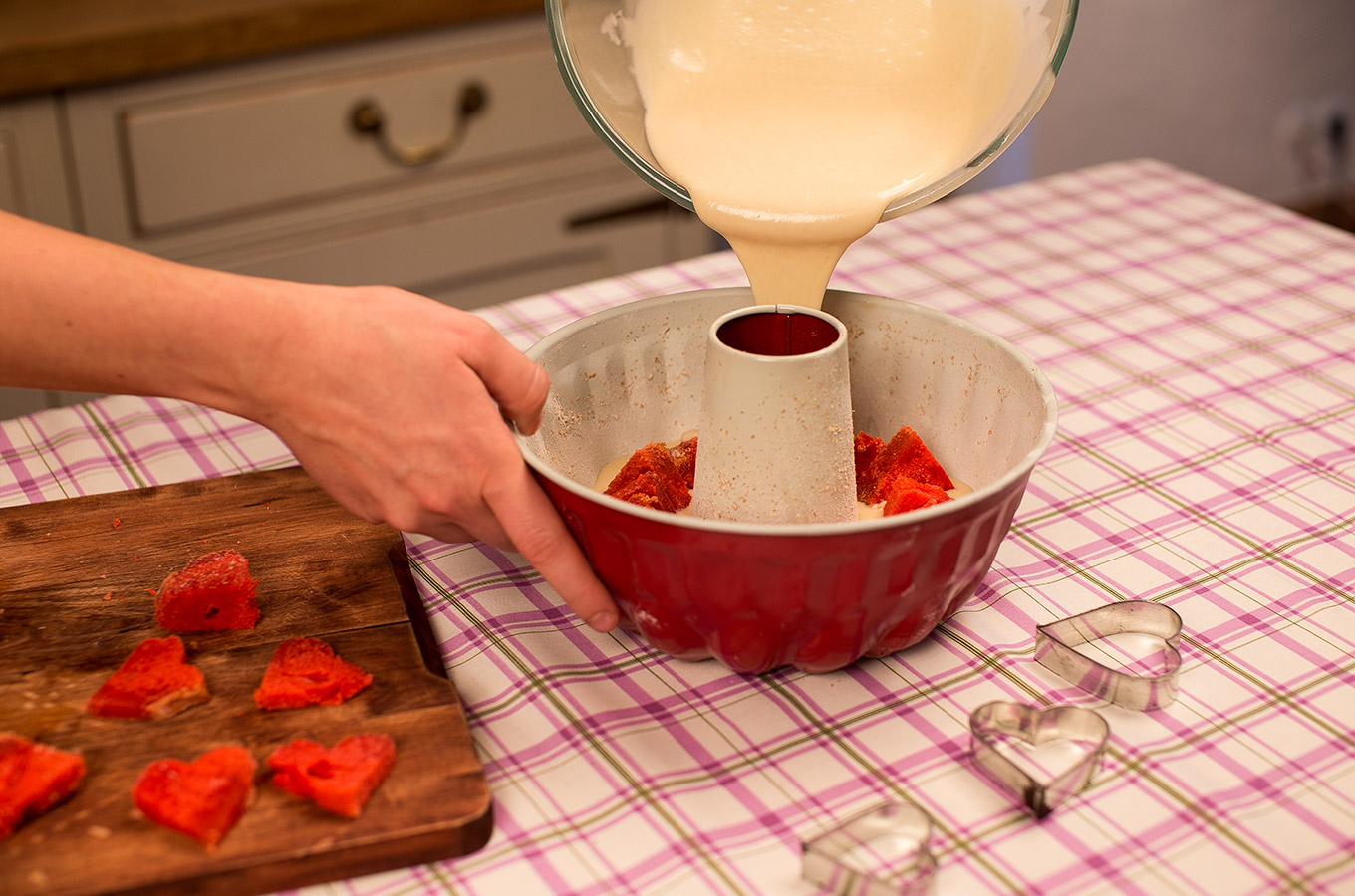 Vylejeme do vymazanej a posypanej rovnej formy. Pečieme cca 20 – 30 minút na 180 °C. Necháme vychladnúť a vykrajujeme srdiečkovou formičkou. Do bábovkovej formy vkladáme srdiečka vedľa seba ako na obrázku.