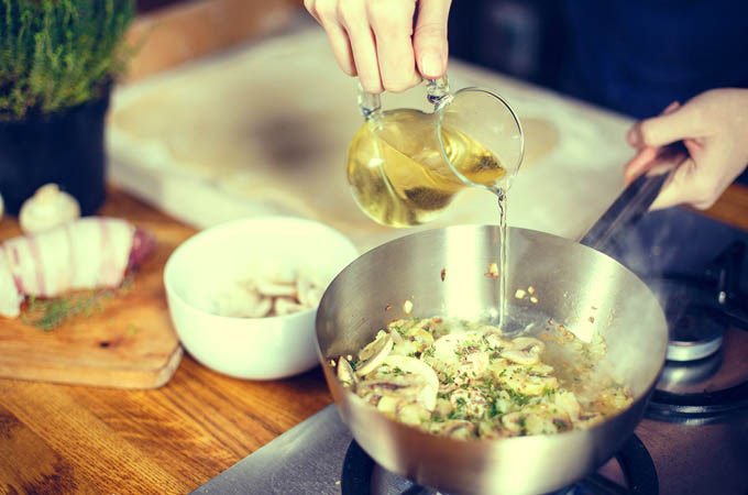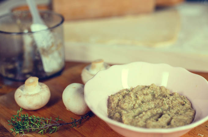 Na olivovom oleji osmažíme šalotku, na ktorej podusíme pokrájané šampiňóny. Dochutíme soľou, korením, pretlačeným cesnakom a čerstvým tymianom, podlejeme vínom a ešte chvíľku dusíme, kým sa víno nevyparí.