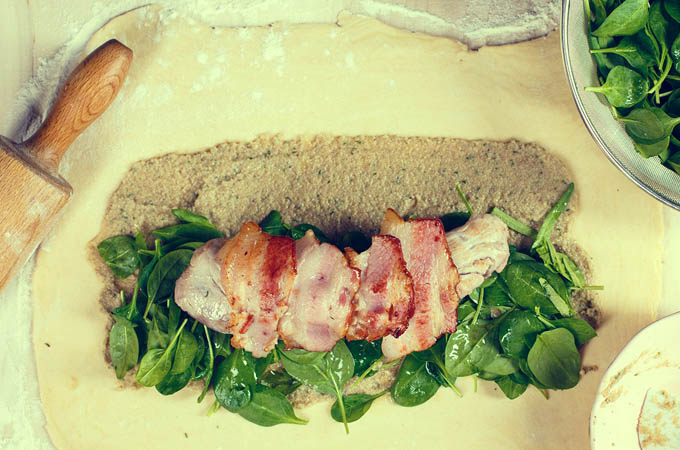 Lístkové cesto vyvaľkáme, potrieme pripravenou fášou, pridáme špenát a položíme naň panenku, ktorú sme predtým obalili v slaninke, osolili, okorenili a narýchlo opražili z každej strany na panvici.