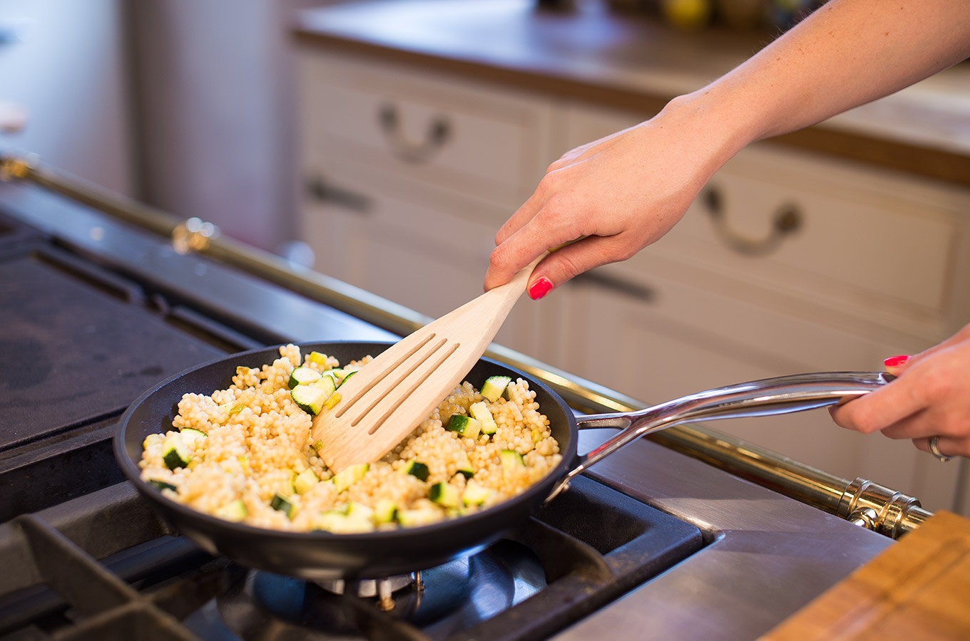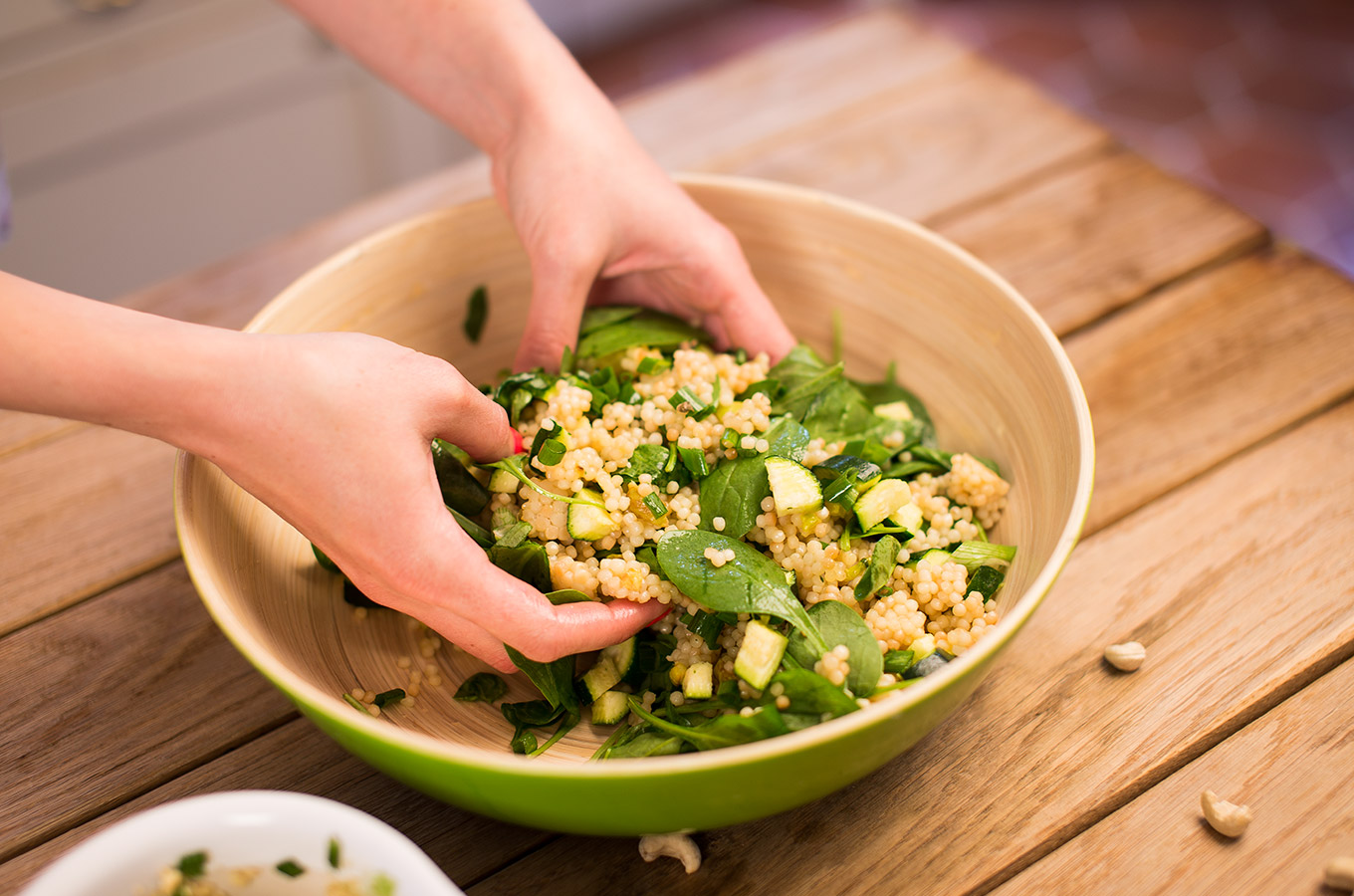 Do uvarenej tarhone s cuketou vmiešame omáčku a pridáme nasekanú na šikmé plátky nakrájanú jarnú cibuľku a hrsť baby špenátu.