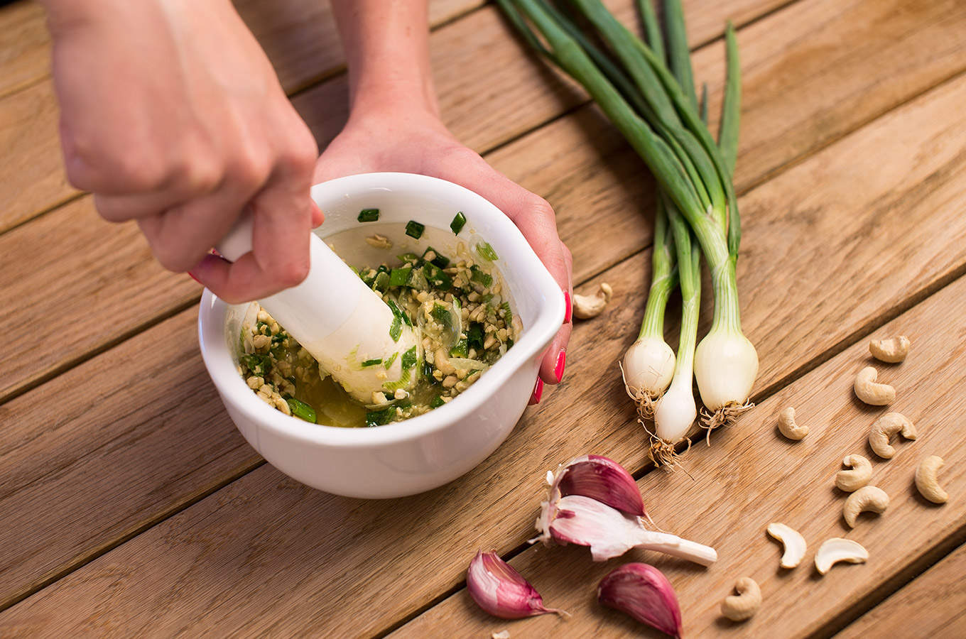 Zatiaľ si pripravíme v mažiari alebo v mixéri omáčku: zmixujeme jednu jarnú cibuľku, oriešky, cesnak a olej.