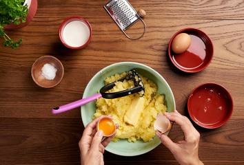 Zemiaky rozmačkáme dohladka, pridáme žĺtka, maslo, ½ lyžičky soli, korenie a muškátový orech a ¾ smotany.