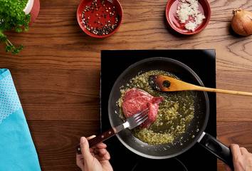 1.Mäso umyjeme, osušíme, odblaníme. Nakrájame na plátky, po obvode narežeme a vyklepeme. Okoreníme. 2.Na rozpálenom ohni sprudka mäso opečieme z oboch strán dobiela, aby sa zatiahlo. Vyberieme a odložíme bokom. 3.Očistenú cibuľu nakrájame a na výpeku z mäsa opečieme dozlata. Podlejeme trochou horúcej vody, povaríme, kým sa voda odparí a pridáme mäso. 4. Osolíme, zalejeme horúcou vodou alebo vývarom tak, aby bolo mäso podliate a prikryté dusíme. Dávame pozor, aby sa mäso nepripálilo, ak treba, dolievame po troche horúcu vodu alebo vývar. Tip: Najprv dajte dusiť mäso a medzitým pripravujte pusinky.